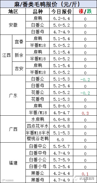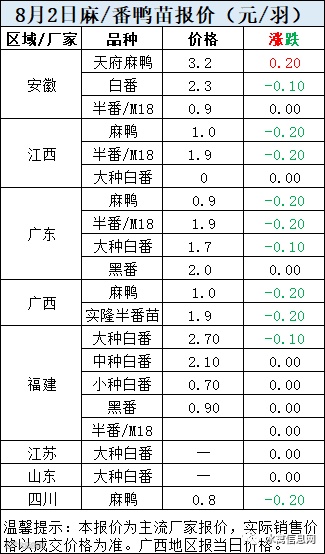 明日麻鸭苗报价下滑0.2元/羽。半番鸭苗报价下滑0.2元/羽。