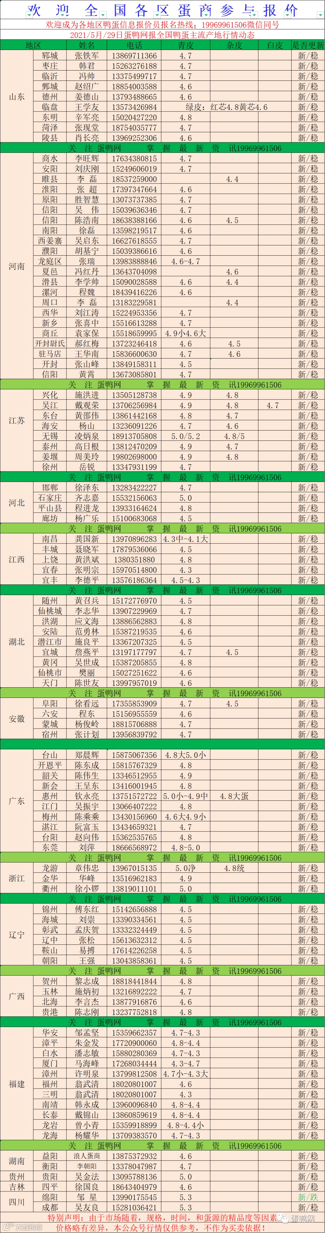 2021年5月28日鲜鸭蛋价格:初产4.8至大蛋4.4(鸭蛋价格仅供参考)。