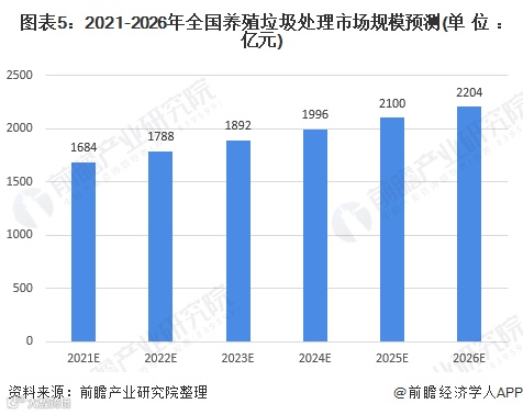 畜禽粪污资源化利用的步伐明显加快,有力促进了畜牧业生产与环境保护协调发展。前瞻初步预计到2026年,我国养殖垃圾处理市场规模将达到2200亿元。