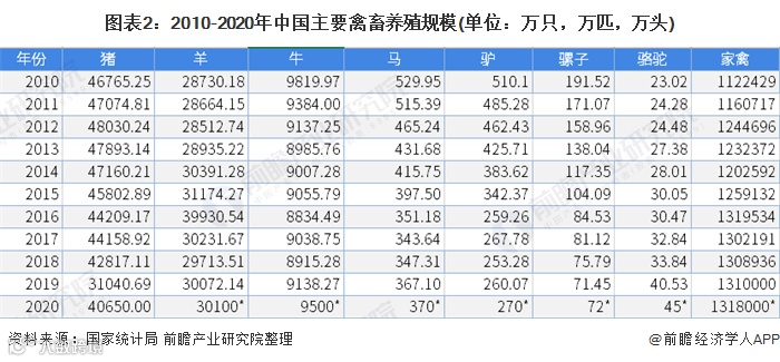 2019年受非洲猪瘟的影响,我国生猪养殖规模大幅下滑,2020年,在全球生猪养殖规模大幅下降的背景下,中国的生猪养殖规模在国家相关政策指导和扶持下有所恢复。总体来看,在禽畜需求增长的推动下,我国禽畜养殖规模整体呈现增长趋势。