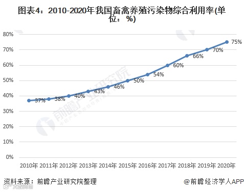 与日益增长的畜产品需求和养殖废弃物产生量相比,我国畜禽养殖废弃物的综合利用率却不高。数据显示,2010年全国畜禽粪污的综合利用率仅为37.00%,随着“十二五”和“十三五”期间,全国加大畜禽养殖规模化的建设和畜禽粪污的治理力度,畜禽粪污的综合利用情况加快,根据国务院发布的《关于加快推进畜禽养殖废弃物资源化利用的意见》我国在2020年将形成科学规范、权责清晰、约束有力的畜禽养殖废弃物资源化利用制度。根据农业部数据显示,目前我国畜禽粪污综合利用率达到75%,规模养殖场粪污处理设施装备配套率达到93%。