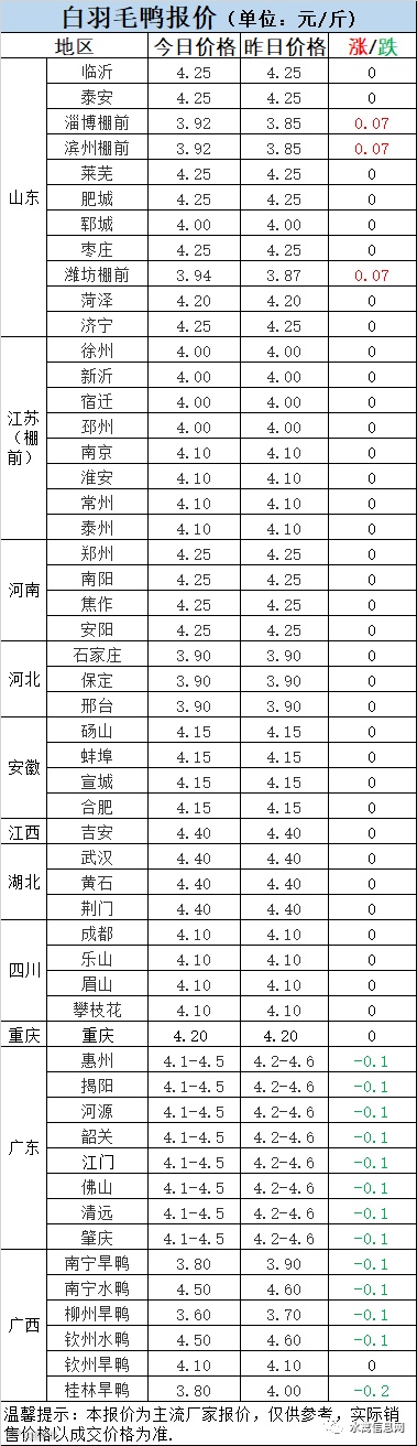 1:今晚北方分割鸭区域报价整体稳定,山东棚前小幅攀升。鸭病严重,出栏率略有下降,但当前冻品价格仍较压抑,传导至毛鸭端价格支撑仍不足。