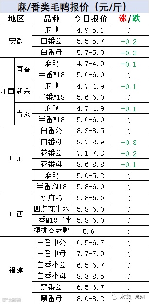 明日麻鸭苗报价下滑0.2/羽。半番鸭苗继续下滑0.2元/羽。