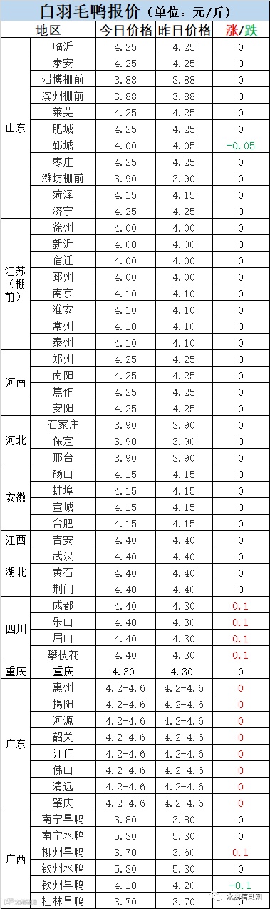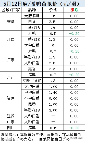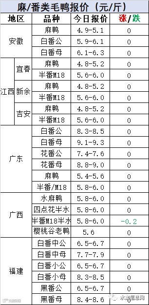 明日麻鸭苗报价下滑0.2元/羽。半番鸭苗稳定。