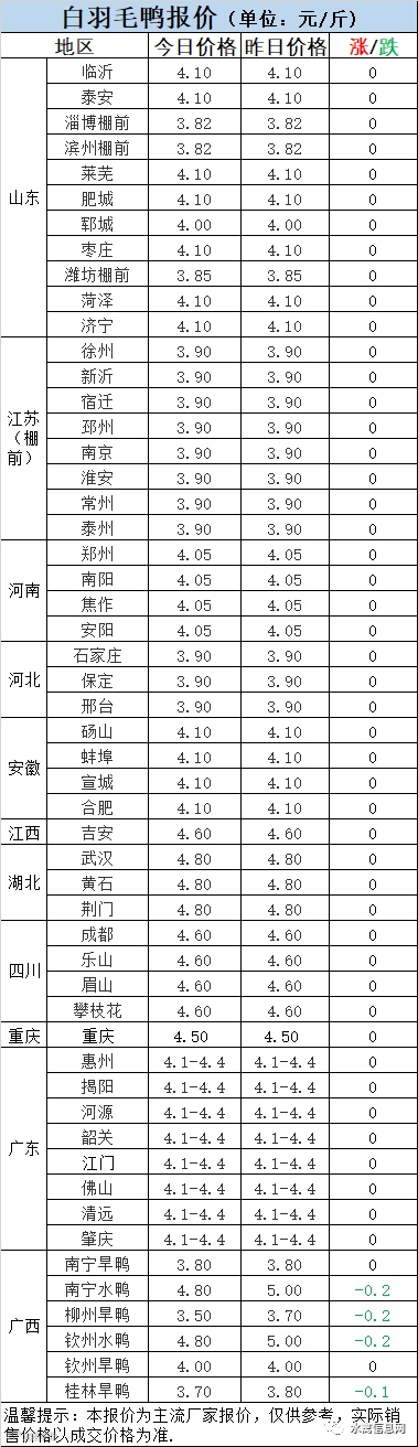 1:今晚北方分割鸭区域报价整体稳定。节后冷藏走货放缓,产品价格面临下滑压力较大,冷藏对市场鸭价支撑减弱。