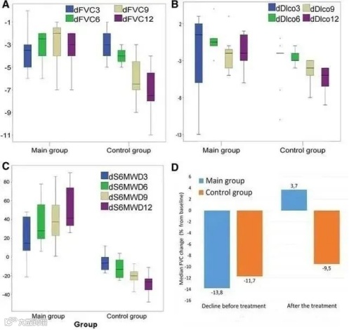 根据对肺功能指标的分析显示,同安慰剂组相比,MSC干预组的FVC(用力肺活量)、DLCO(一氧化碳弥散量)、6MWTD(6分钟步行距离测试距离)各项指标相对于都有所提升。提示间充质干细胞具有一定的干预效果,遏制了肺纤维化的快速发展,安全性评估未发现相关的不良反应事件,证明了干细胞的有效性和安全性。