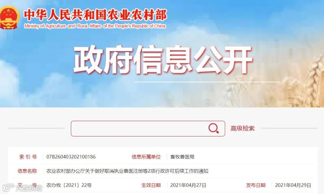 农业农村部办公厅关于做好取消执业兽医注册等2项行政许可后续工作的通知