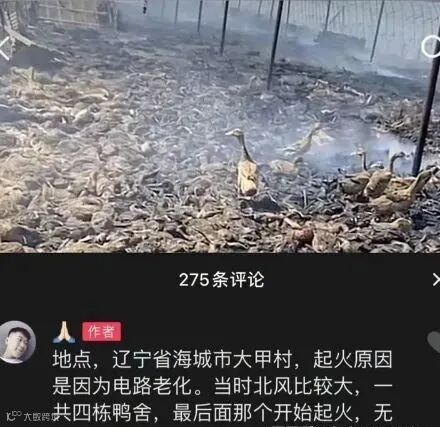 4月5号,在辽宁海城一鸭场因电路起火,四栋鸭舍无一幸免,上万只鸭子变成了烤鸭,现场一片狼藉,面对这些损失,养殖户要哭了。