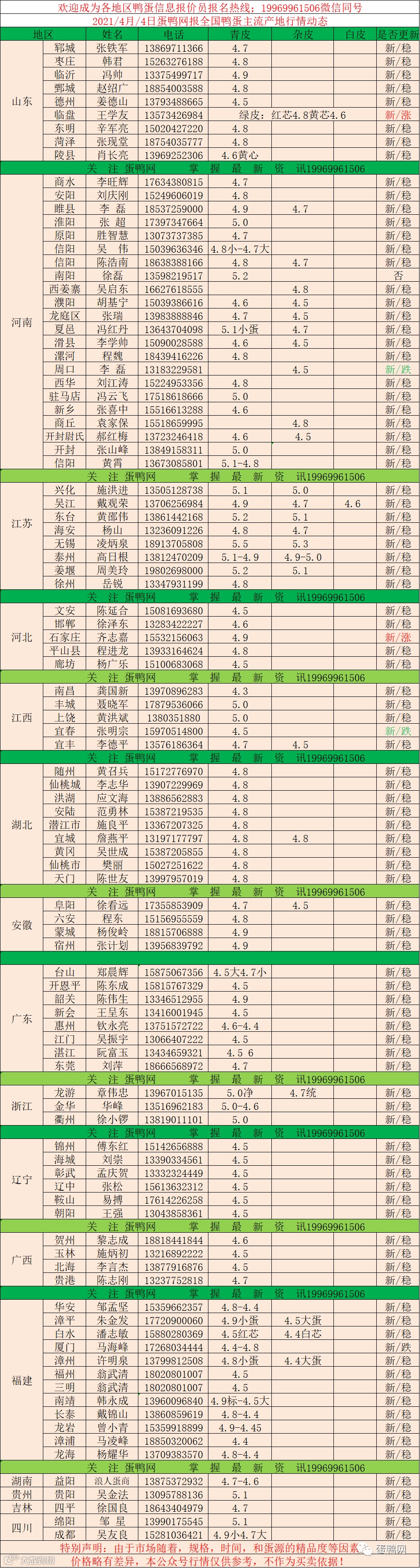 2021年4月4日鲜鸭蛋价格:初产至大蛋4.5(鸭蛋价格仅供参考)。