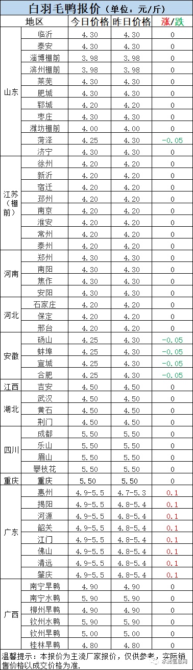 1:今晚北方毛鸭报价震荡走弱。山东局部、安徽下滑0.05元/羽。