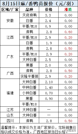 明日麻鸭苗报价上涨0.5元/羽,半番鸭苗报价上涨0.2元/羽。
