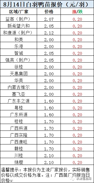 一、8月14日白羽鸭苗报价