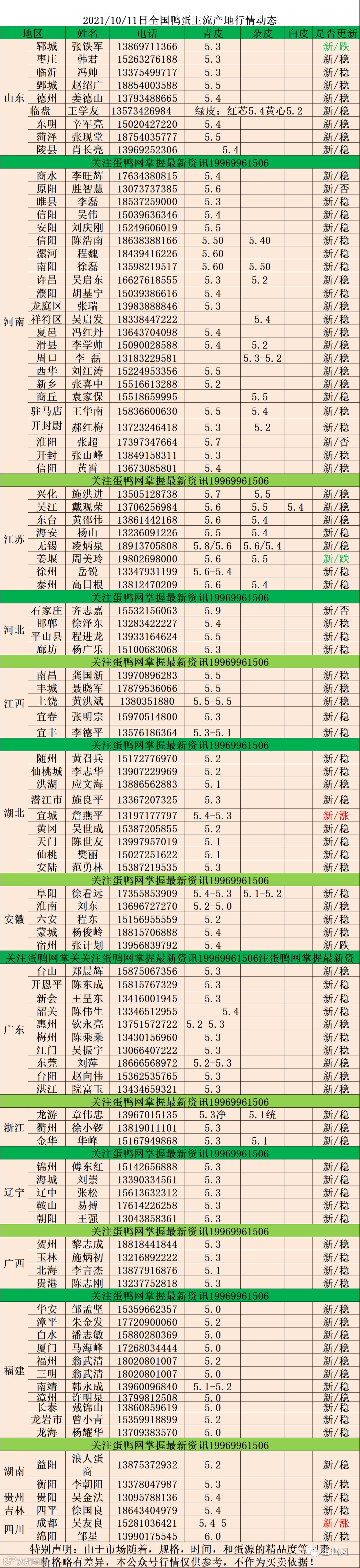 2021年10月11日鲜鸭蛋价格:初产至10个头5.0元 。 10个头至大蛋5.3(鸭蛋价格仅供参考)。