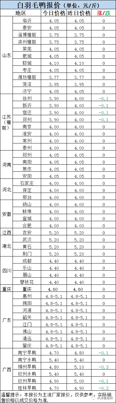 1:今晚北方毛鸭报价整体趋弱走势,疫情及产品弱势拖带毛鸭支撑乏力。苏北继续下调0.1元/斤,其他区域弱稳。