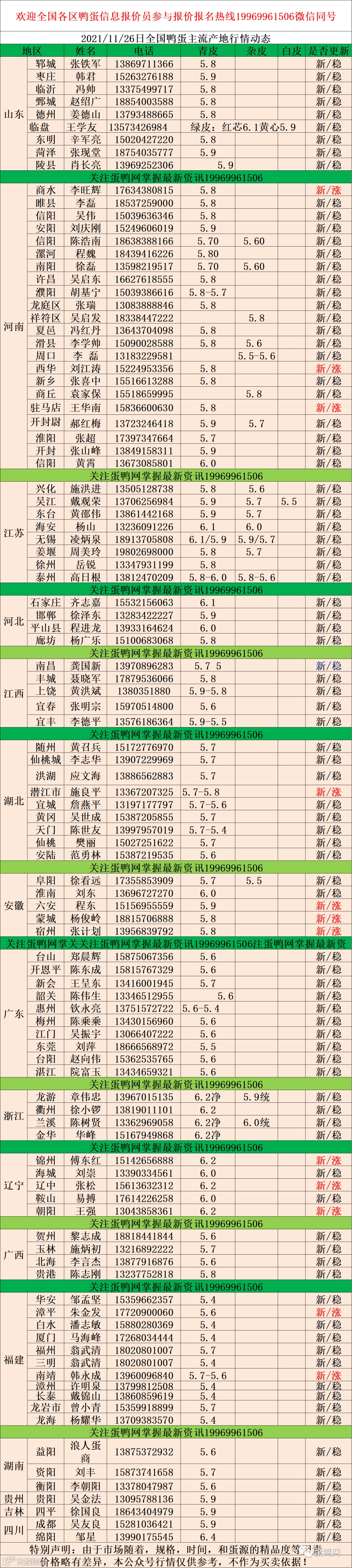 2021年11月26日鲜鸭蛋价格:初产至10个头5.4元。 10个头至9个5.6元。9个至8个5.8元。8个至大蛋6.2元(鸭蛋价格仅供参考)。