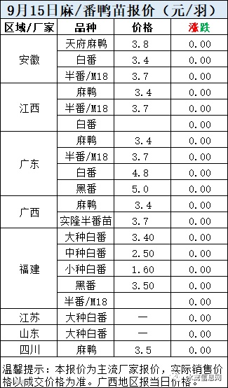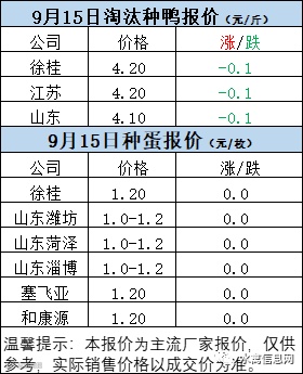 一、9月14日晚至9月15日 白羽肉鸭报价