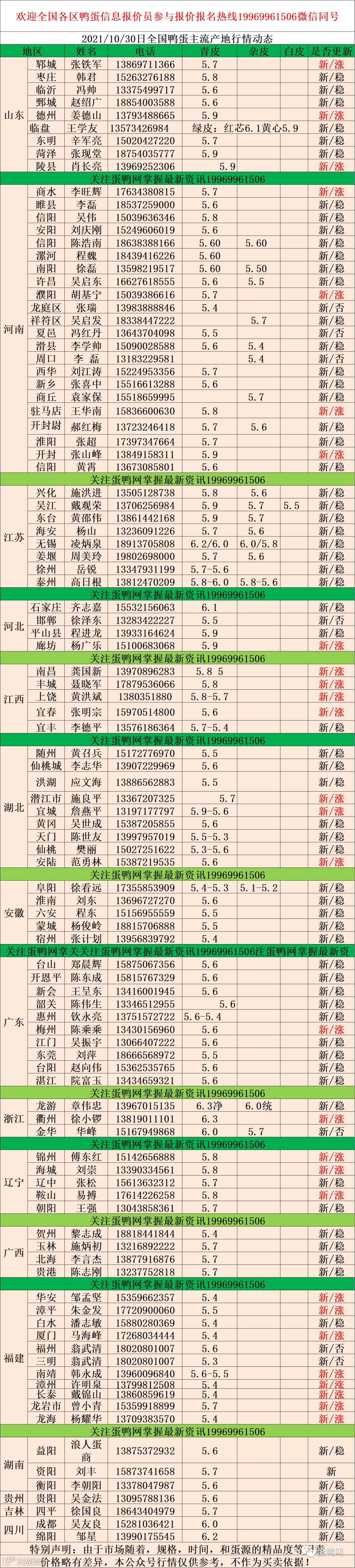 2021年10月30日鲜鸭蛋价格:初产至10个头5.4元 。 10个头至大蛋5.8(鸭蛋价格仅供参考)。