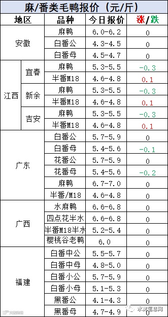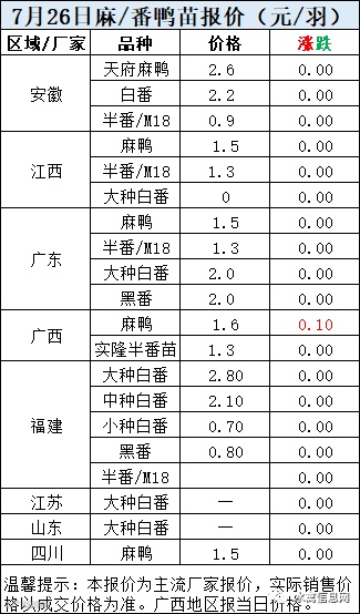 明日麻鸭苗报价整体稳定,广西报价上涨0.1元/羽。半番鸭苗报价稳定。