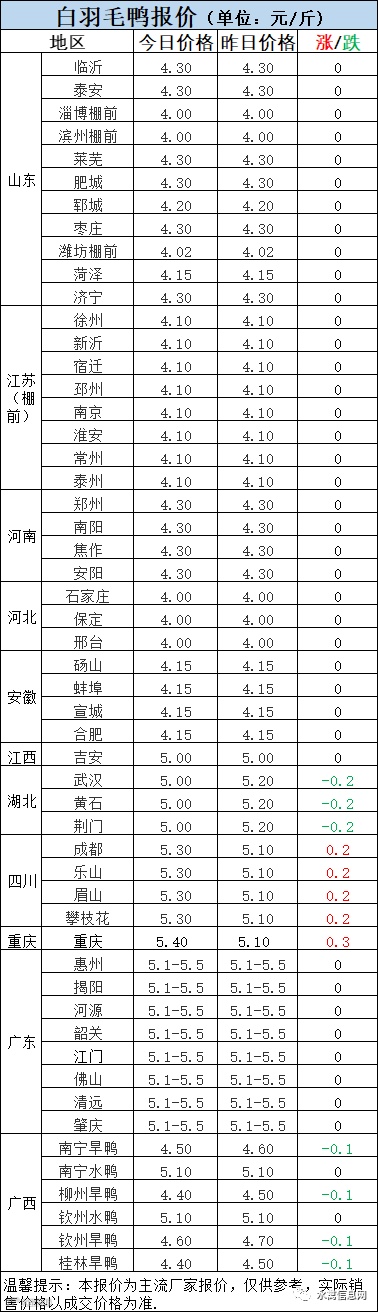 1:今晚北方毛鸭报价整体稳定。天热放养量下降,回收率降低,冻品渐次走强,拉动毛鸭价格上涨。疾病严重,饲料高位,导致合同鸭回收成本持续高位,产品低位运行,冷藏日子依然艰难。