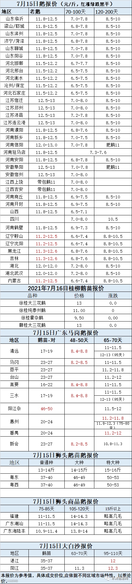 2021年7月15日鹅种蛋价格(元/枚)停报