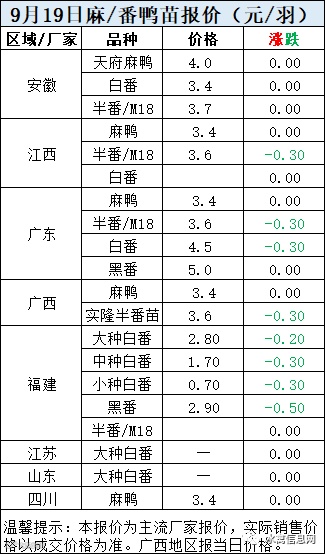 一、9月19日白羽鸭苗报价
