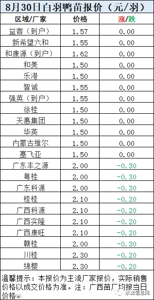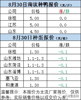 一、8月29日晚至8月30日 白羽肉鸭报价