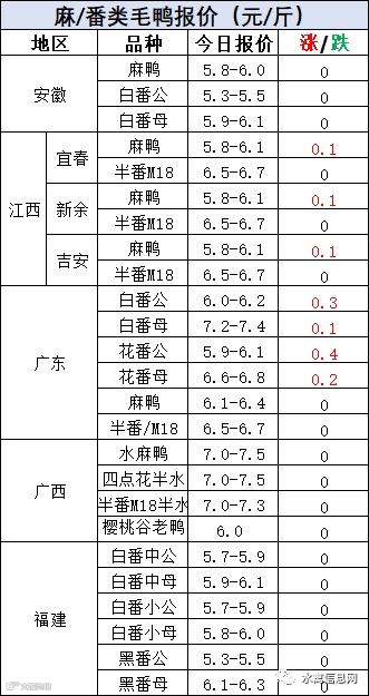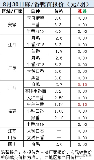 明日麻鸭苗报价稳定,广西上涨0.1元/羽。半番鸭苗报价稳定。