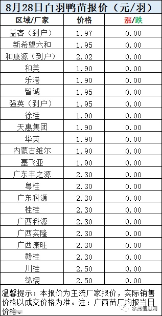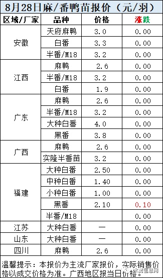 一、8月28日白羽鸭苗报价