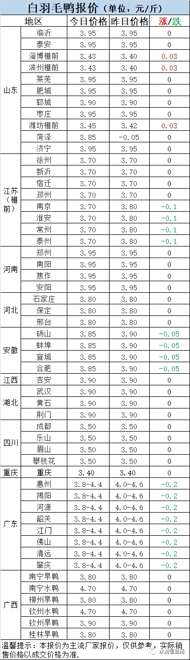 1:今晚北方毛鸭报价整体稳定,山东棚前小幅上调。疾病严重,饲料高位,导致合同鸭回收成本持续高位,产品低位运行,冷藏日子依然艰难。