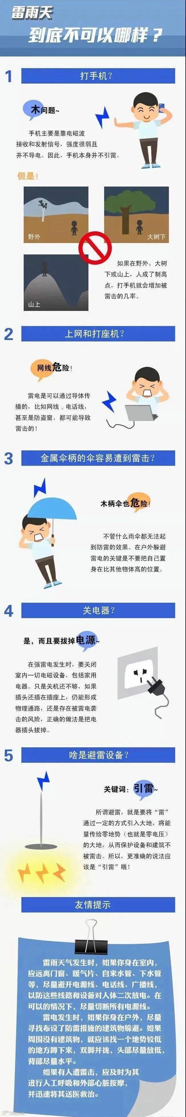 注意防范雷雨大风天气,关好门窗,提前收好放置于阳台、窗边的易坠落物品,防范高空坠物;注意用电安全;尽量避免户外活动,室外人员不要在树下、电杆下、塔吊下避雨;注意防范局地短时强降水导致的路面湿滑、能见度下降对交通出行的不利影响。