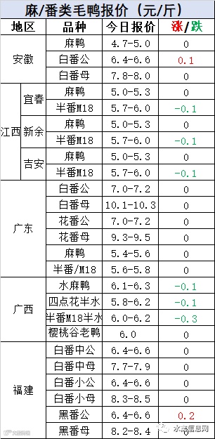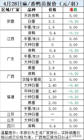 明日麻鸭苗报价连续下滑。半番鸭苗报价稳定。