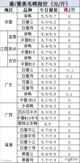 明日麻鸭苗广东、江西上涨0.1元/羽,其他区域稳定。