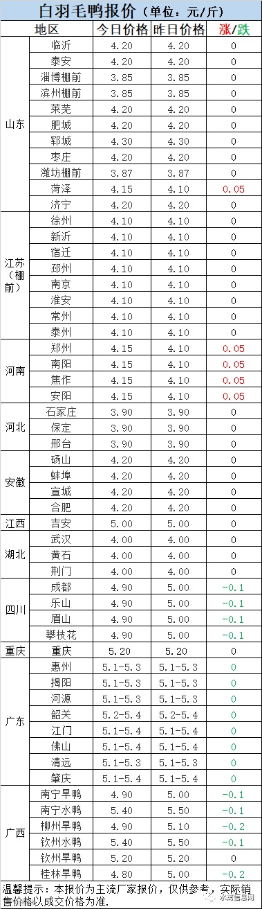 2:南方活禽区域,震荡调整。广东市场鸭今晚报价稳定,但局部实际成交价仍有小幅下滑。广西报价继续下滑。