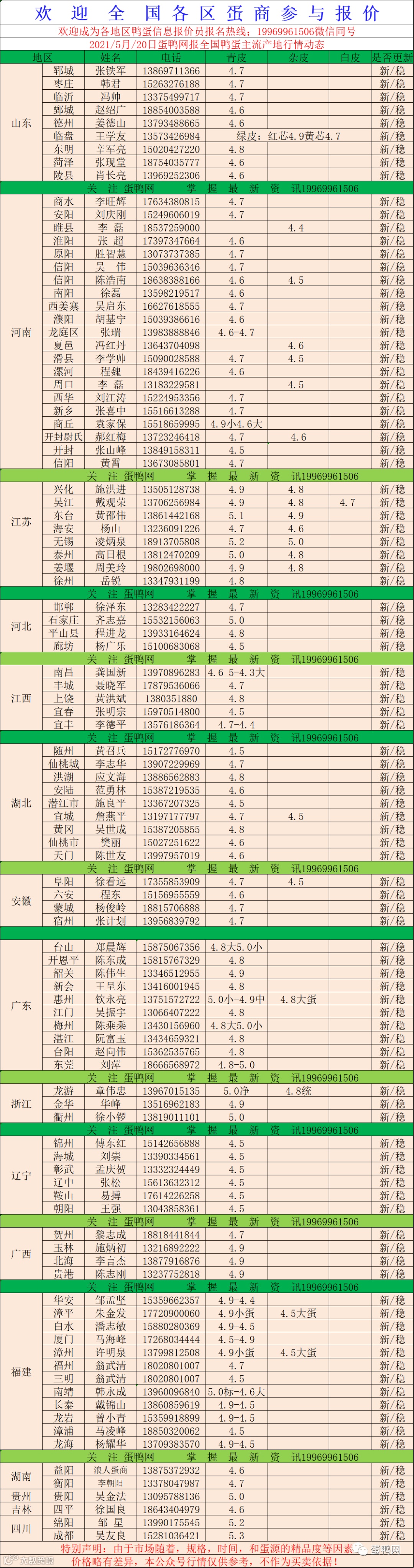 2021年5月20日鲜鸭蛋价格:初产5.0至大蛋4.5(鸭蛋价格仅供参考)。