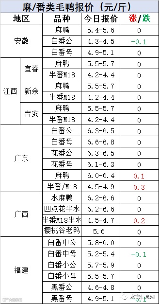 明日麻鸭苗报价稳定。半番鸭苗报价上涨0.2元/羽。
