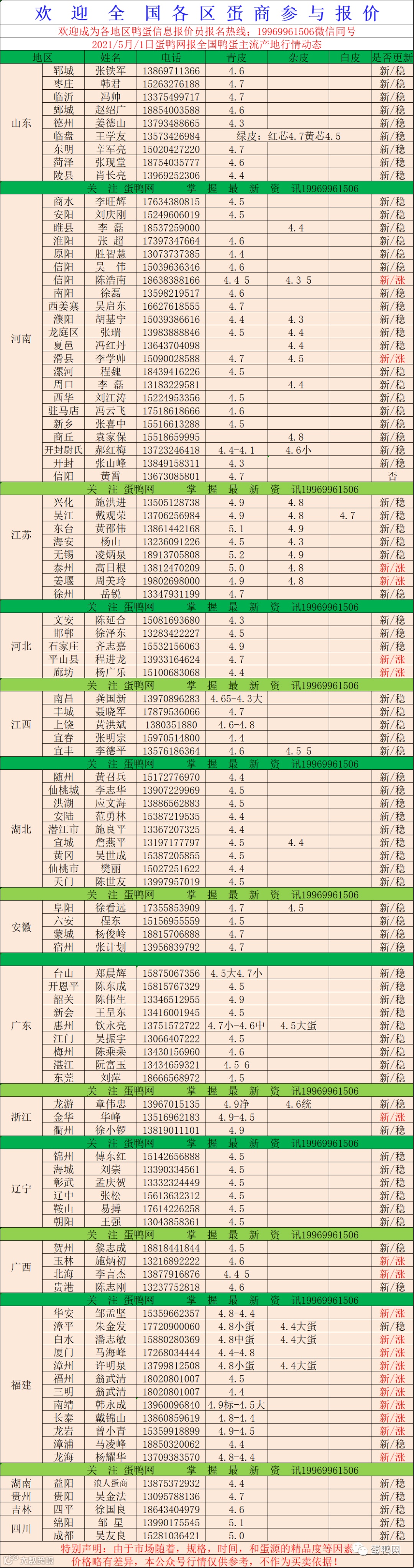 2021年5月1日鲜鸭蛋价格:初产至大蛋4.5(鸭蛋价格仅供参考)。