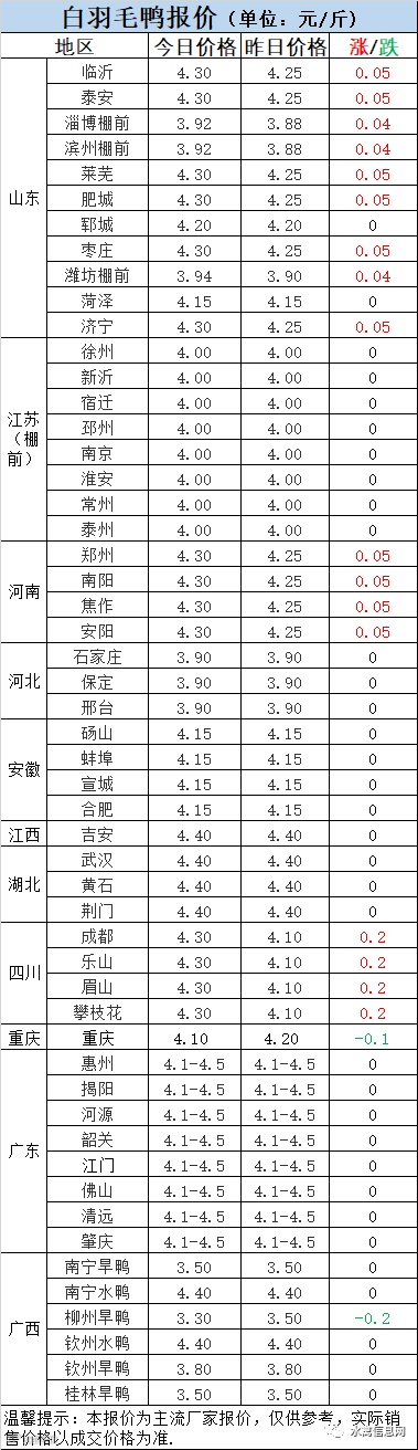 明日麻鸭苗报价上涨0.1元/羽。半番鸭苗报价上涨0.1元/羽。