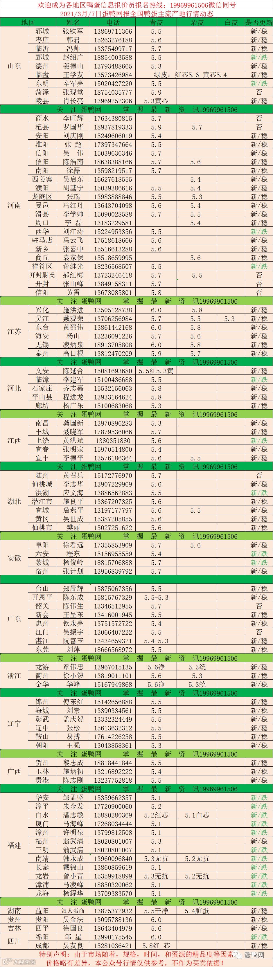 2021年3月7日鲜鸭蛋价格:初产至10个头4.8元, 10个头至9个头5.1。9个至8个头5.3元, 8个头至7.5个头5.4元。7.5个头以上5.5元。(鸭蛋价格仅供参考)。