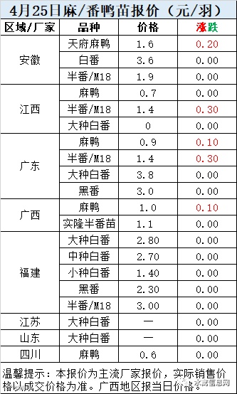 明日麻鸭苗报价上涨0.1-0.2元/羽。半番鸭苗报价上涨0.3元/羽。
