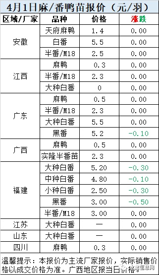 一、4月1日白羽鸭苗报价