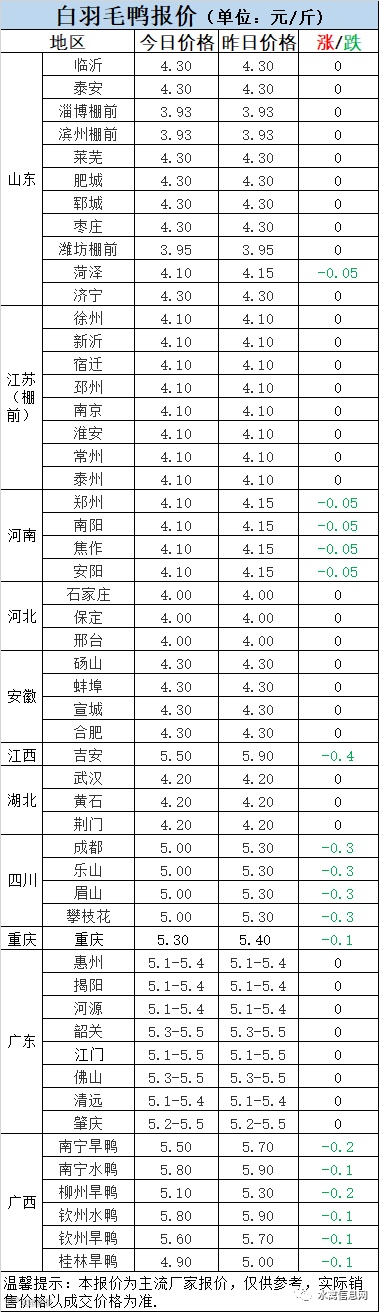 2:南方活禽区域,广东市场鸭连续下滑后,今晚稳定,局部实际成交略有恢复,广西毛鸭追跌下滑。整体市场仍呈弱势状态。