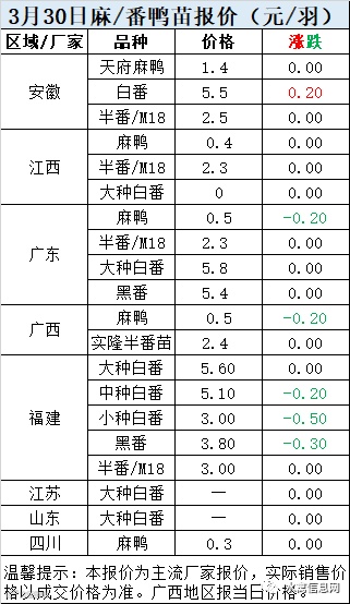 一、3月30日白羽鸭苗报价