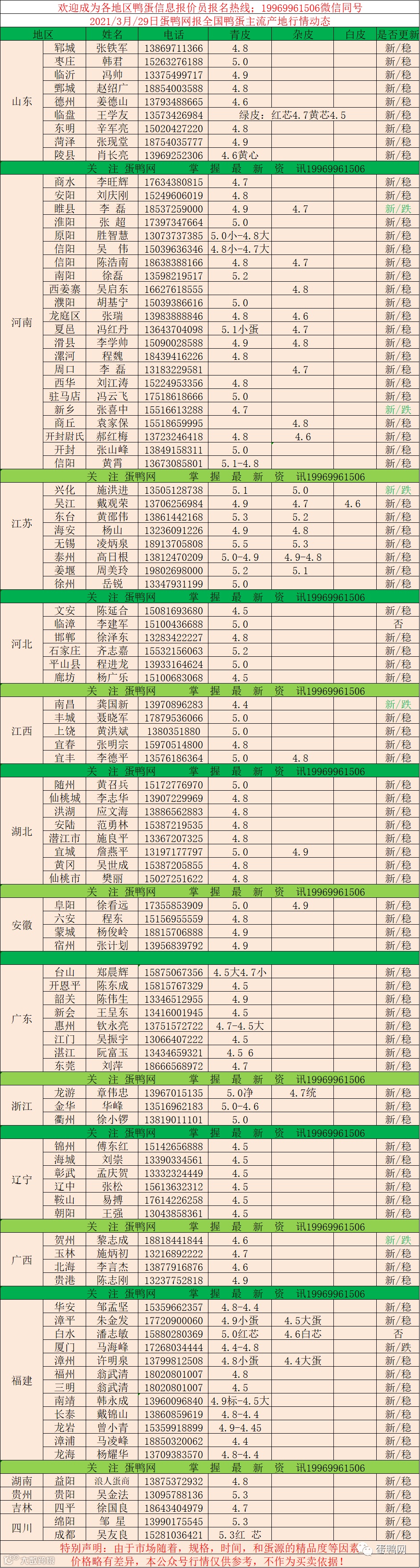 2021年3月29日鲜鸭蛋价格:初产至大蛋4.5(鸭蛋价格仅供参考)。