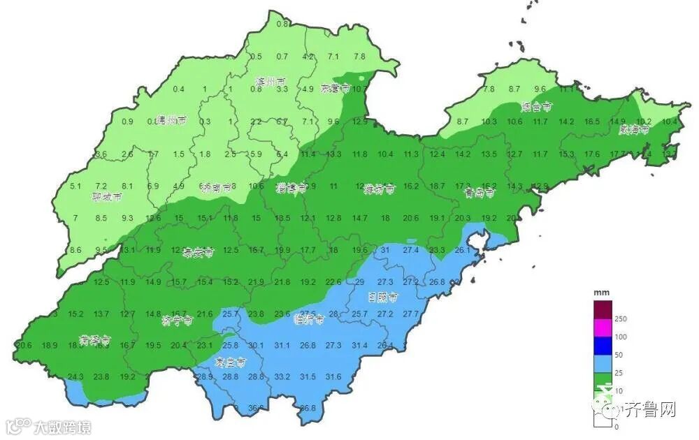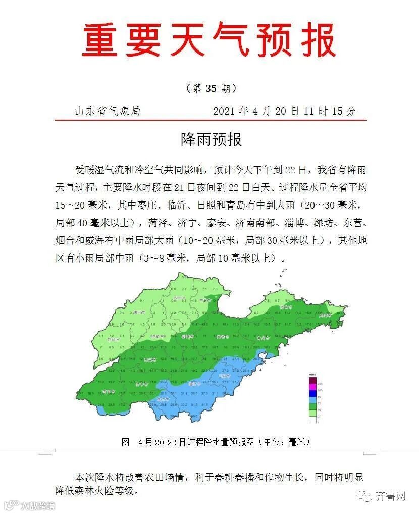 山东省气象局今天发布 降雨预报, 受暖湿气流和冷空气共同影响, 预计今天下午到22日, 我省有降雨天气过程, 主要降水时段 在21日夜间到22日白天。 过程降水量 全省平均15~20毫米 其中枣庄、临沂、日照和青岛 有中到大雨 (20~30毫米,局部40毫米以上) 菏泽、济宁、泰安、济南南部 淄博、潍坊、东营、烟台和威海 有中雨局部大雨 (10~20毫米,局部30毫米以上) 其他地区 有小雨局部中雨 (3~8毫米,局部10毫米以上)。 图 4月20-22日过程降水量预报图(单位:毫米) 本次降水将改善农田墒情, 利于春耕春播和作物生长, 同时将明显降低森林火险等级。