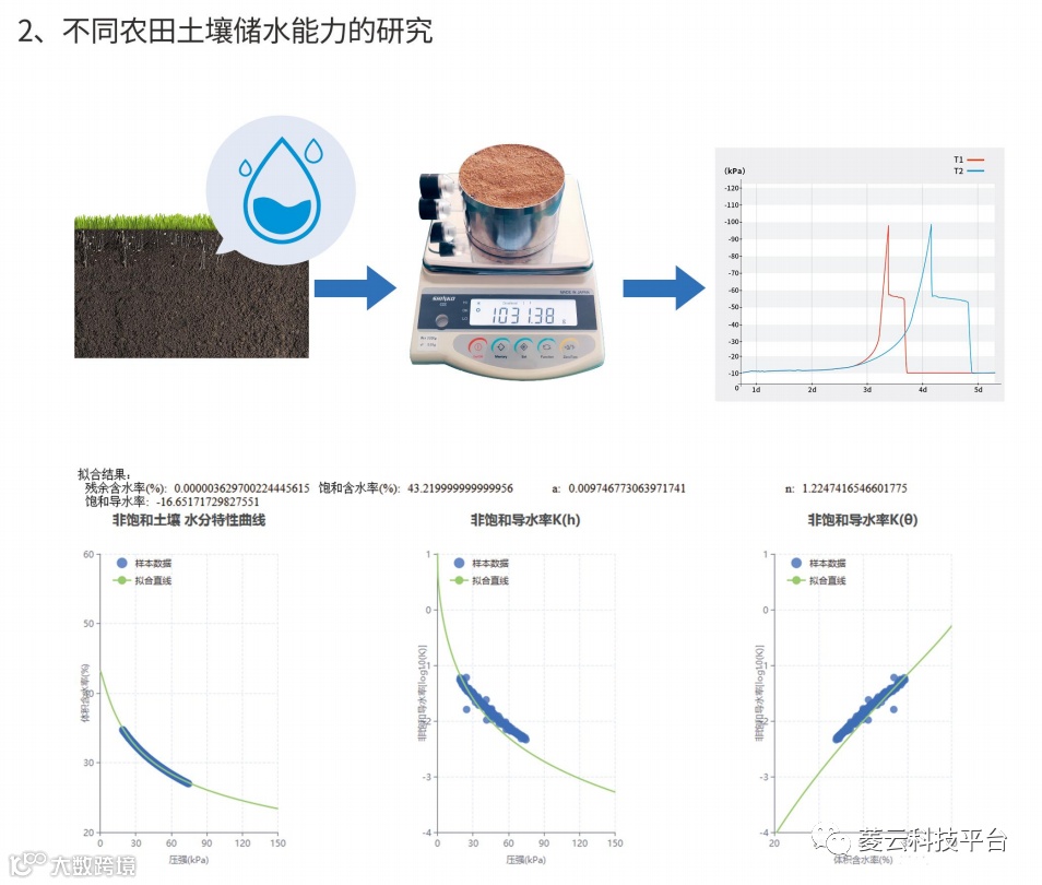 利用饱和-蒸发原理,运用不同深度的2个迷你张力计系统和精确称重系统测定土壤水分特征曲线、土壤非饱和导水率、土壤体积含水量、土壤阶梯水势等。非饱和导水率是反应土壤水分运动规律的基本物理特性。