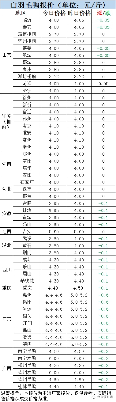2:南方活禽区域市场报价震荡下行,节日消费势头已过,市场逐步回归平淡,近期毛鸭持续下落调整。