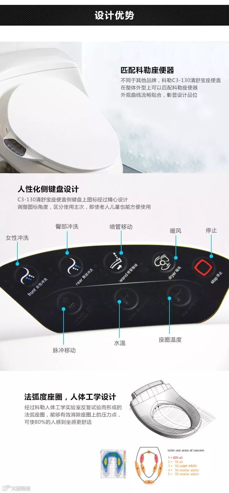 和正智能马桶专设通便清洗功能,便前冲洗,可按摩肛门周围穴道,润滑肠道,软化和分解干燥结块的大便,帮助排便,根除便秘,灌肠排毒。