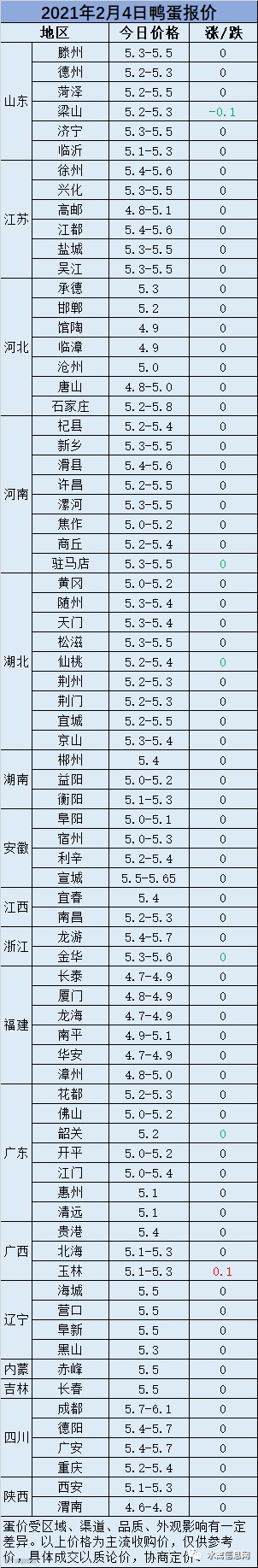 【鸭蛋价格】2021年2月4日鸭蛋报价:弱势调整,局部下滑。