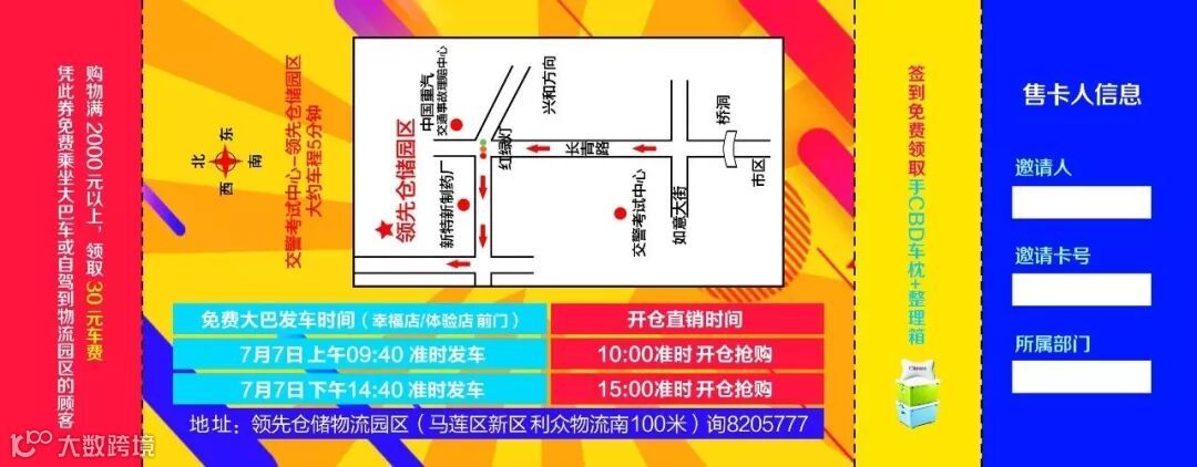 2.凭此卡自行去仓储活动现场,购物满2000元返车费30元+抽奖1次(抽奖最低5元现金);