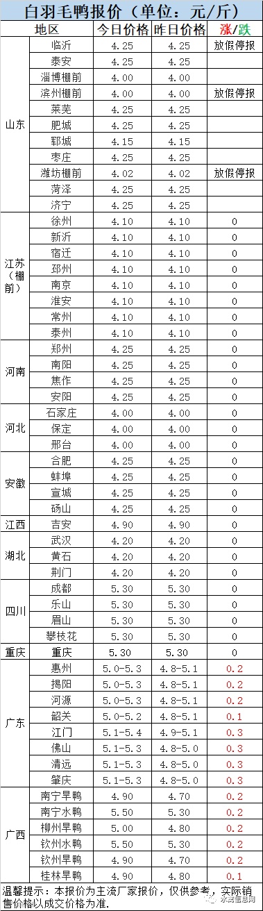 1:近期出栏大鸭为春节期间补栏,数量较少,部分厂家已放假停收,市场缺乏主流报价。当前冷藏走货较慢,产品再次下滑,预计开盘后毛鸭价位仍呈弱势。随着回收成本的逐步攀升,冷藏经营风险愈发严峻,刀尖上起舞,各种不确定性预期增加。